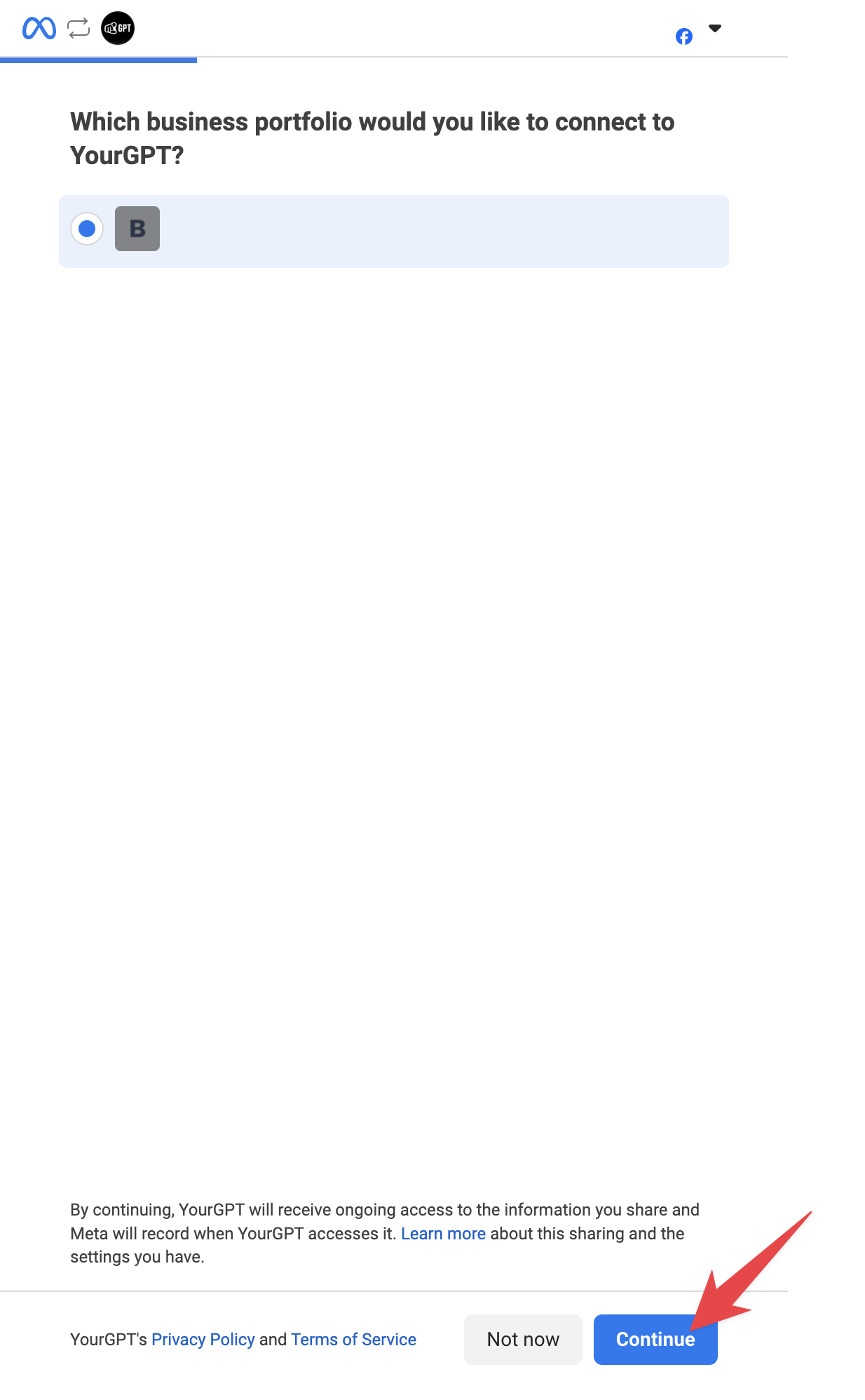 4: Log in to your Facebook account and select Continue as Your Business Name.
