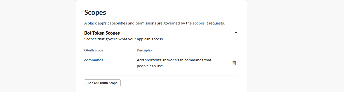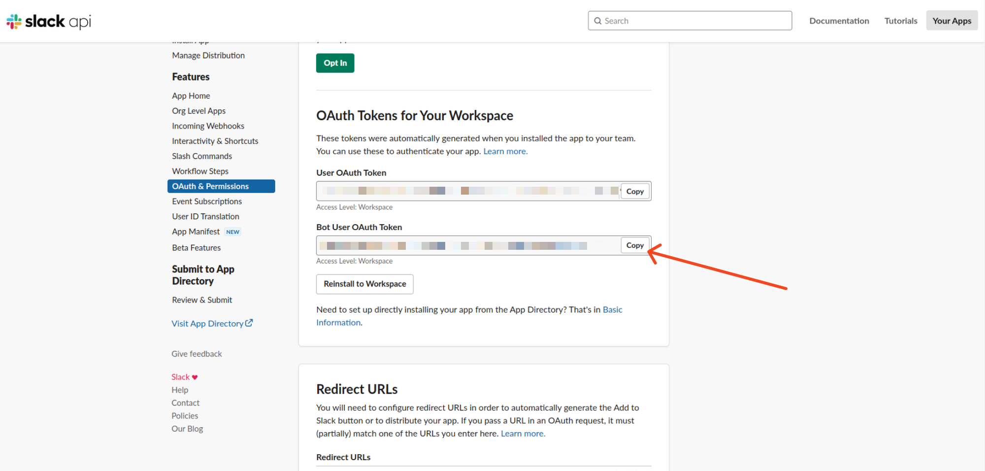 Configure redirect URLs and choose the necessary bot scopes required to access workspace data. Enable bot commands for interaction.