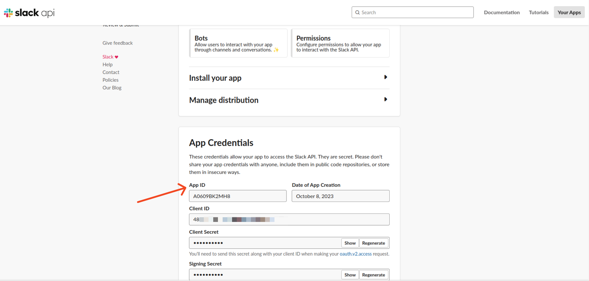 - Obtain the app ID from the Basic Information section of your Slack app.