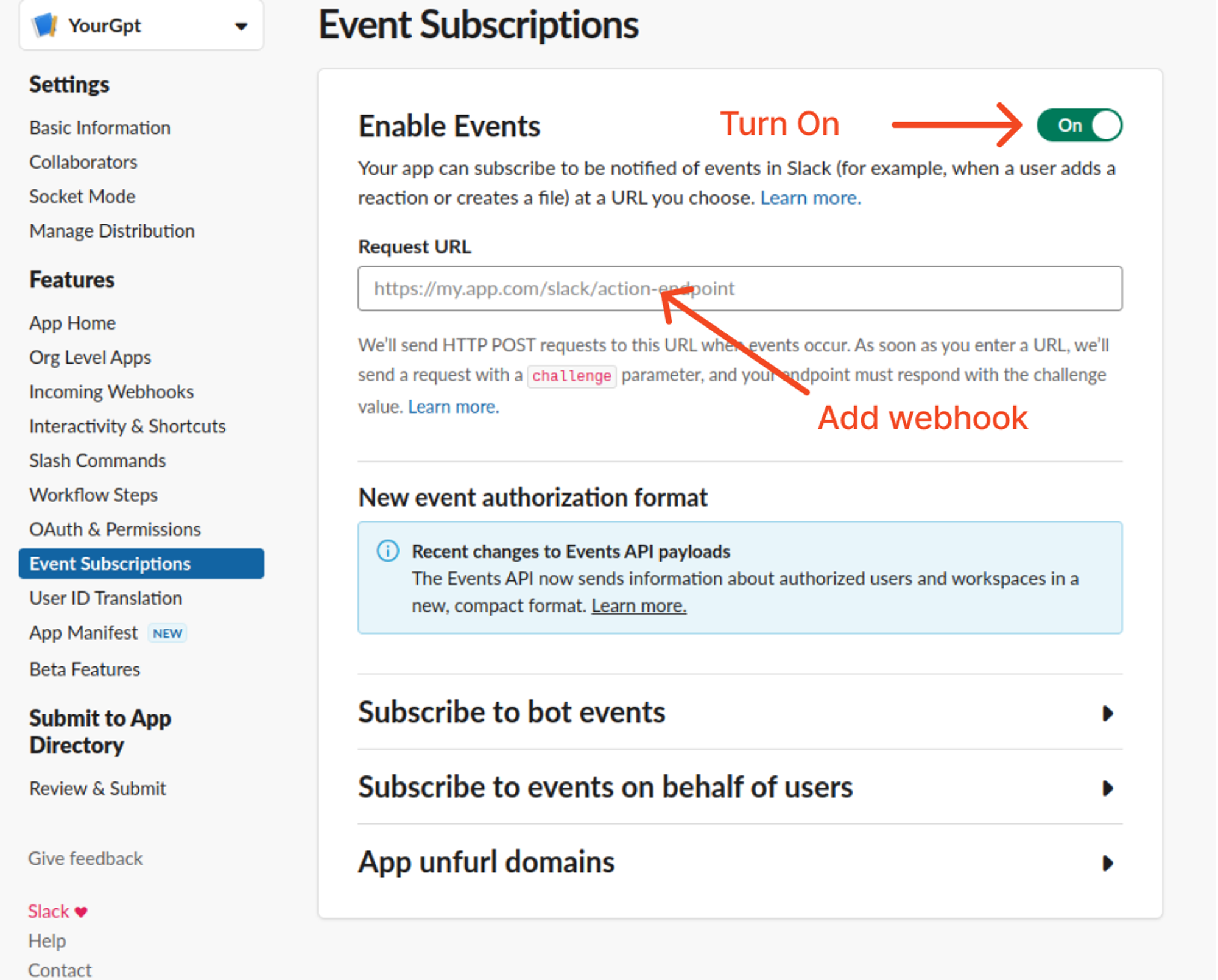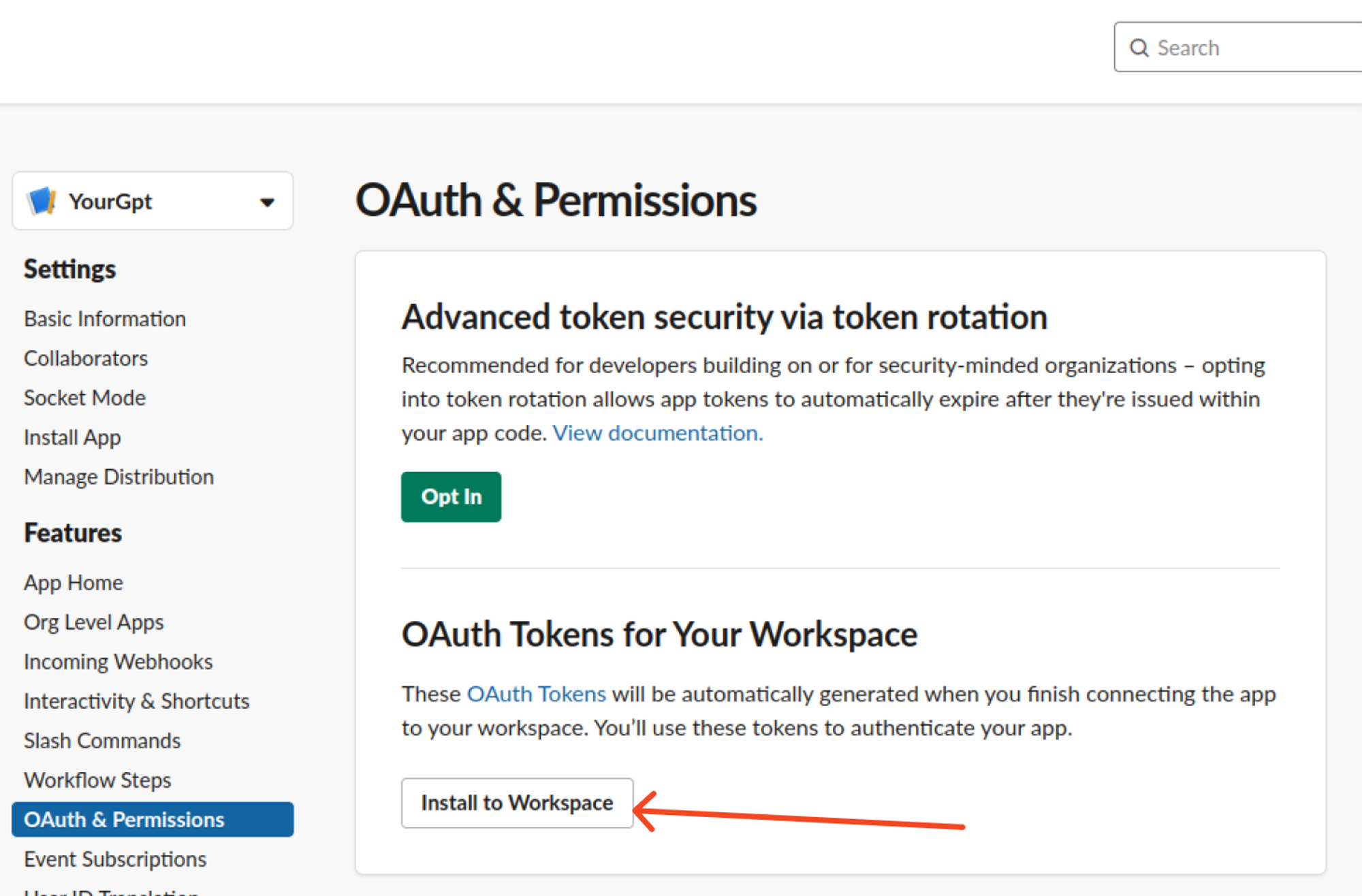 App IDinto theApplication IDfield of YourGPT Slack Integration. - Copy the Bot user Auth Token from the OAuth & Permissions section.