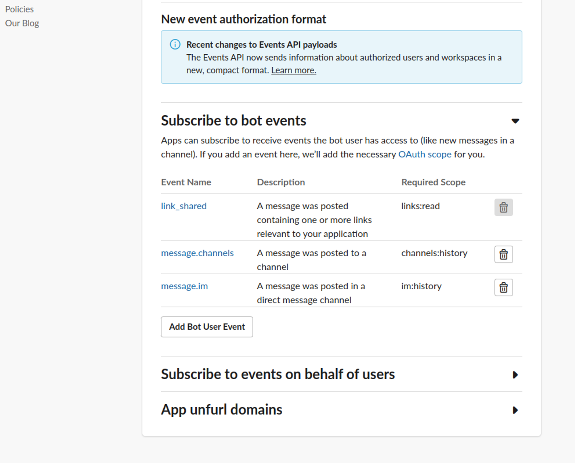 - Subscribe to the link_shared, message.im, and message.channels events.